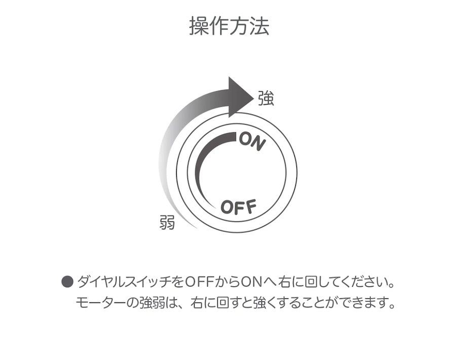 振動パターンは1種類のみで、ダイヤルスイッチを回して強弱を変動させます。